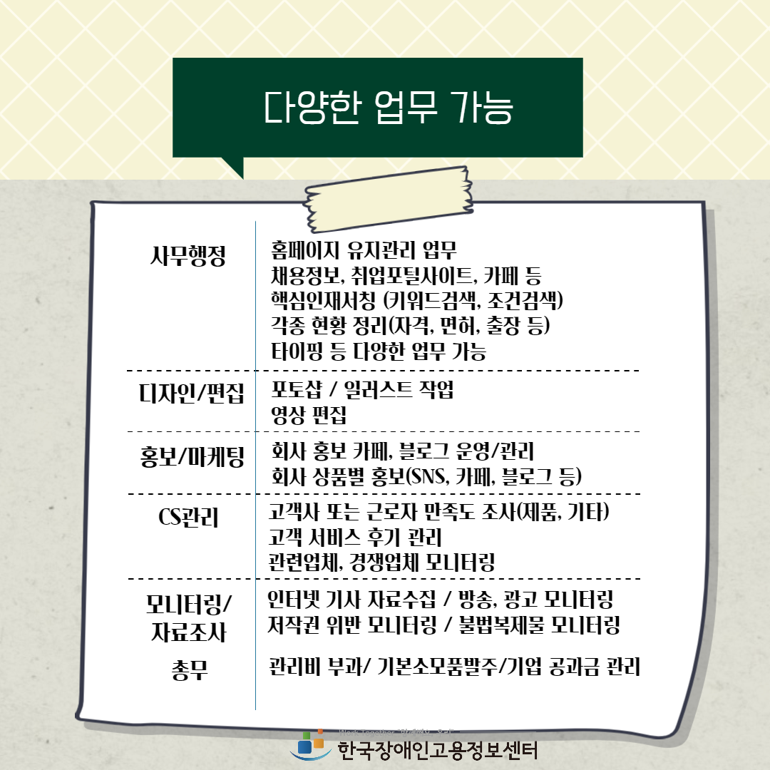 마케팅과 홍보 관련 업무, CS관리 업무, 모니터링과 자료조사는 물론 총무와 관련된 업무까지 다양한 분야에서 장애인 재택근무를 진행할 수 있으니 어떤 업무를 제공해야 할지에 대해 고민할 필요가 없어요!