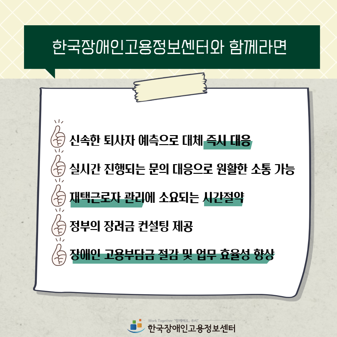 한국장애인고용정보센터와 함께 한다면 신속한 퇴사자 예측이 가능해 즉시 대응이 가능하며 실시간 진행되는 문의에 실시간으로 대응할 수 있어 장애인 재택근무 근로자와 원활한 소통을 할 수 있어요.