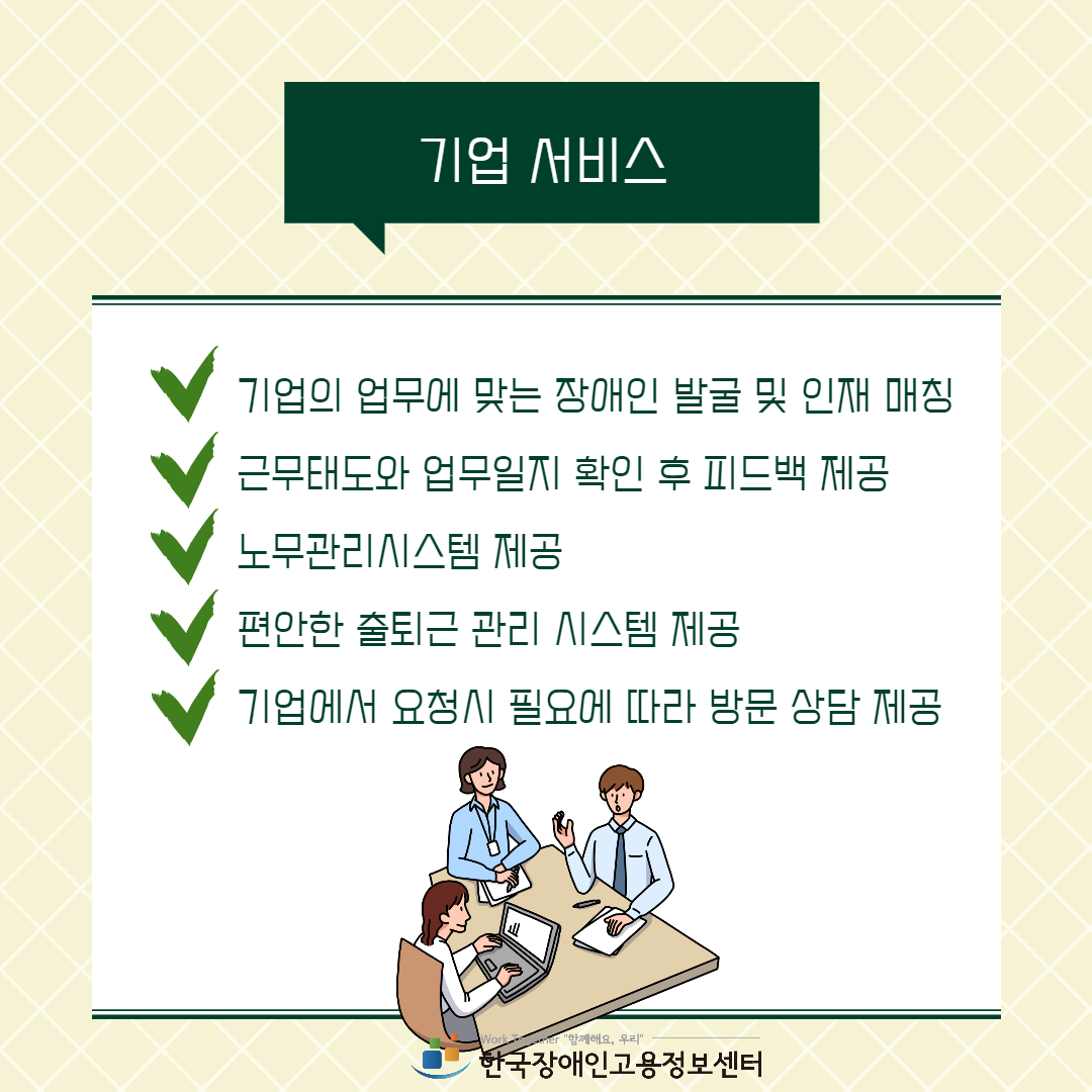 안녕하세요. 한국장애인고용정보센터는 장애인 고용 시 우려되는 사항을 최소화하며 장애인들의 사회구성원으로서의 자립을 돕고 기업의 사회적 가치 실현을 돕는 고용서비스를 제공하고 있