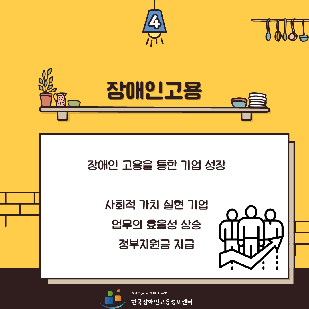 장애인고용을 통해 기업의 성장도 가능합니다. 사회적 가치를 실현하는 기업의 이미지를 만들 수 있으며 업무의 효율성을 높여줄 수 있습니다. 장애인고용을 통해 정부에서 지원하는 다양한 장려금을 지급받아 인건비를 절약할 수도 있습니다.