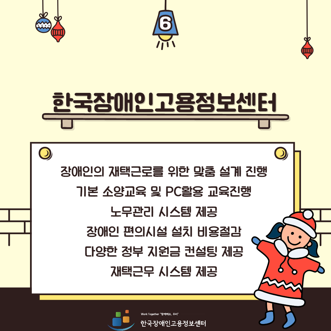 한국장애인고용정보센터에서는 장애인의 재택근로를 위해 맞춤 설계를 진행하고 있으며 기업에 필요한 장애인 인재를 발굴, 교육하고 있습니다. 기본 소양교육은 물론 PC 활용 교육도 진행하고 있어 업무 향상에 도움이 되고 있으며 노무관리와 재택근무 시스템을 제공하고 있어 장애인 근로자를 편히 관리할 수 있습니다. 장애인을 재택근로 형태로 고용하게 되어 장애인 편의시설 설치를 하지 않아도 되어 그만큼 비용을 절감할 수 있으며 다양한 정부 지원금 컨설팅을 제공하고 있어 기업에서 받을 수 있는 지원금을 빠지지 않고 받으실 수 있습니다.