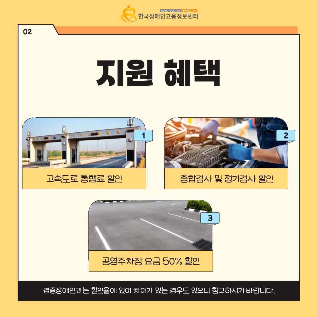 고속도로 통행료, 종합검사 및 정기검사 수수료, 공용주차장 요금을 50% 할인받을 수 있는데요.